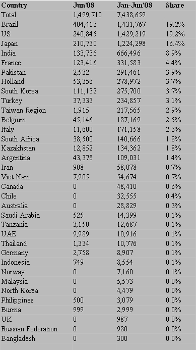 China coke exports from different countries in June 2008 totaled 1,499,710 tonnes and the export from January to June 2008 period totaled 7,438,659 tonnes.